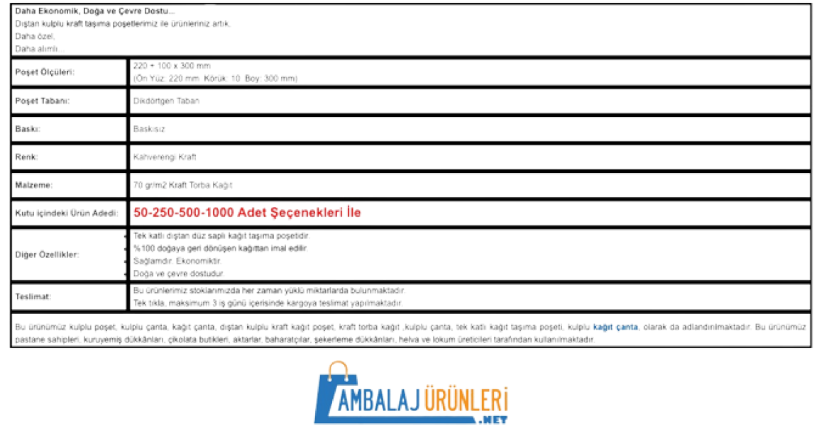 Son yıllarda firmalar ve markalar doğa ve çevre dostu ambalaj ürünlerine yönelmektedir. Büyük firma ve markaların imajı açısından önem taşıyan bu yönelim, müşteri memnuniyetine yönelik bir hamledir. %100 doğaya geri dönüşen kağıtlardan imal edilen bu Kraft Kağıt Çanta, sağlam ve ekonomik yönü ile de tercihiniz olacak.